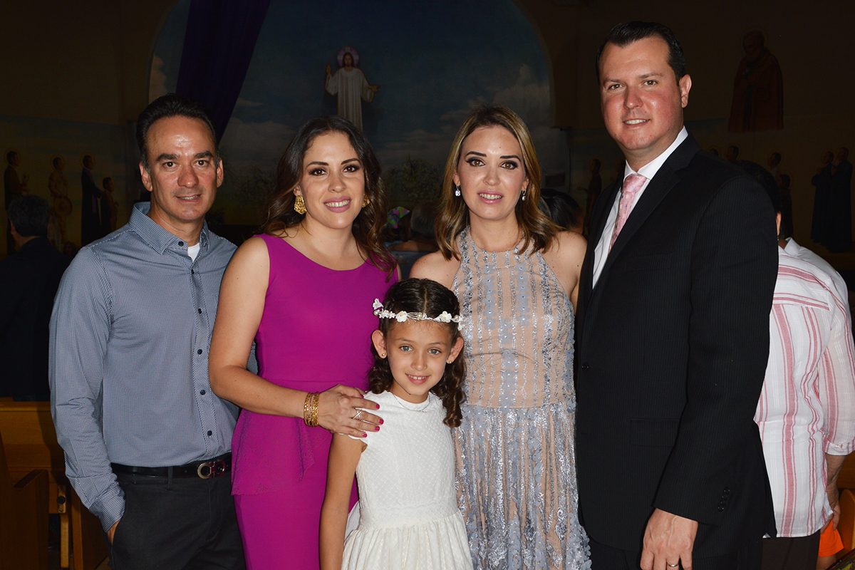 En una emotiva misa celebrada en la Catedral Mártires de Cristo Rey, María Renee Valdés Santos recibió por primera vez el cuerpo y la sangre de Cristo, acompañada de su madrina Franziella Santos de De la Cabada, y de sus papás Mario Valdés y Patricia Santos de Valdés.