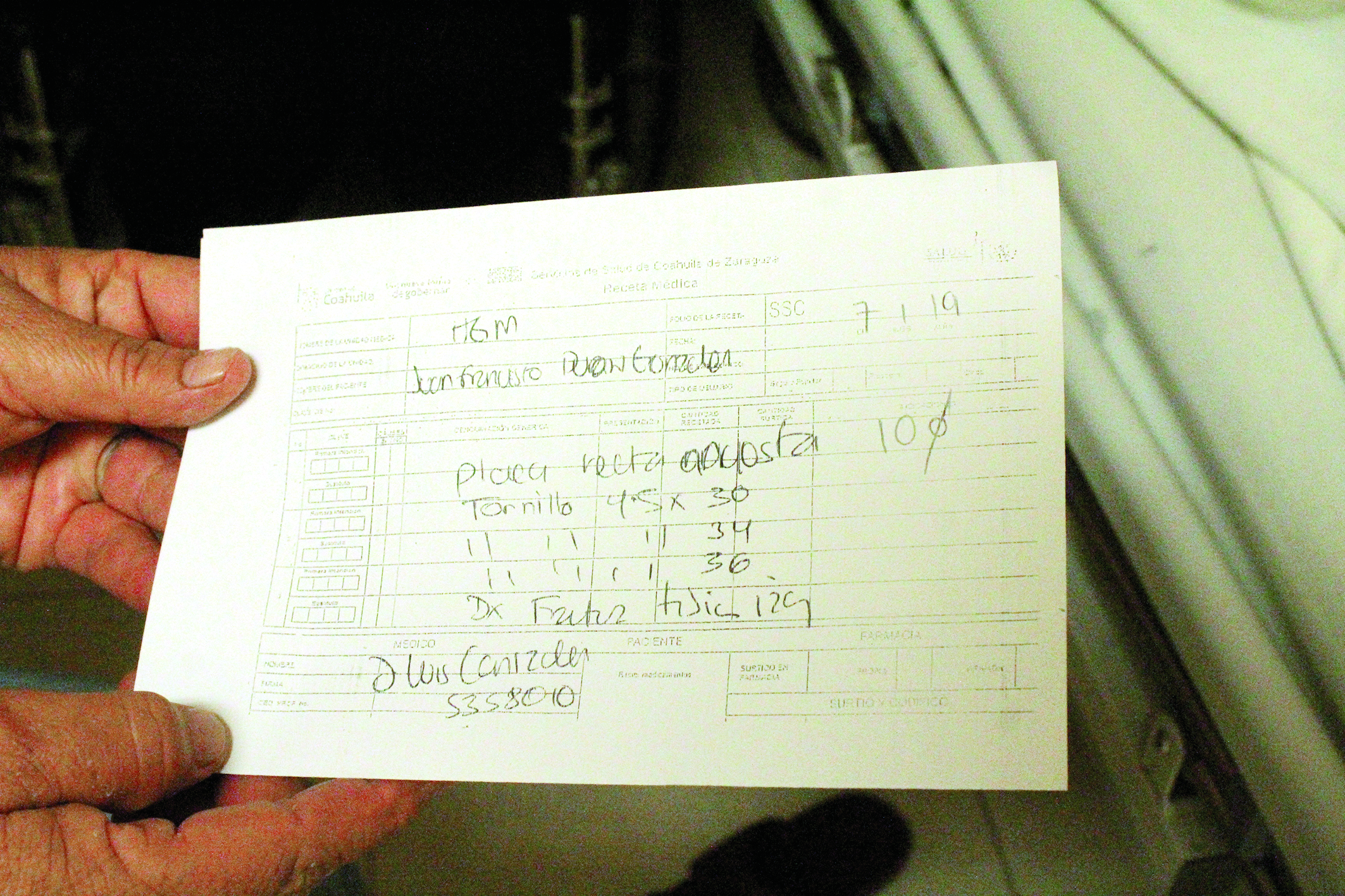 Señaló que su hijo cuenta con seguro popular y no tendrán que pagar hospitalización ni una cirugía que le practicaran el jueves entrante, pero si tienen que estar comprando medicamento inyectable como ceftriaxona y amikacina para infección así como ketorolaco para calmar los intensos dolores que le provocan la fractura de tibia y peroné, además de una placa y tornillos que le deben colocar para que sane la fractura.
