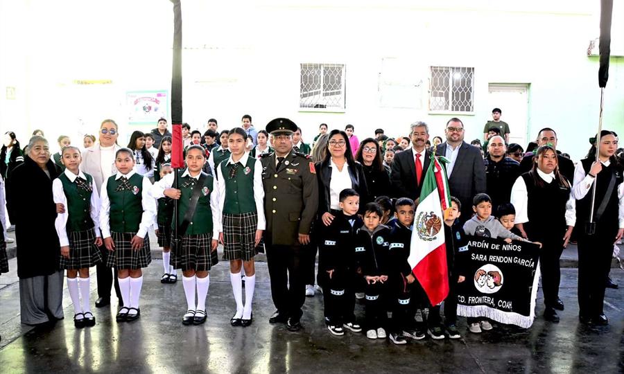 FRONTERA, COAHUILA.- En el marco del 109 aniversario de la Promulgación de la Constitución Política de los Estados Unidos Mexicanos de 1917, el Gobierno Municipal de Frontera, a cargo de la alcaldesa Sari Pérez, llevó a cabo un solemne acto cívico en la Escuela Primaria “Melquiades Ballesteros”, con el objetivo de fortalecer la cultura cívica y refrendar el respeto al Estado de Derecho.
