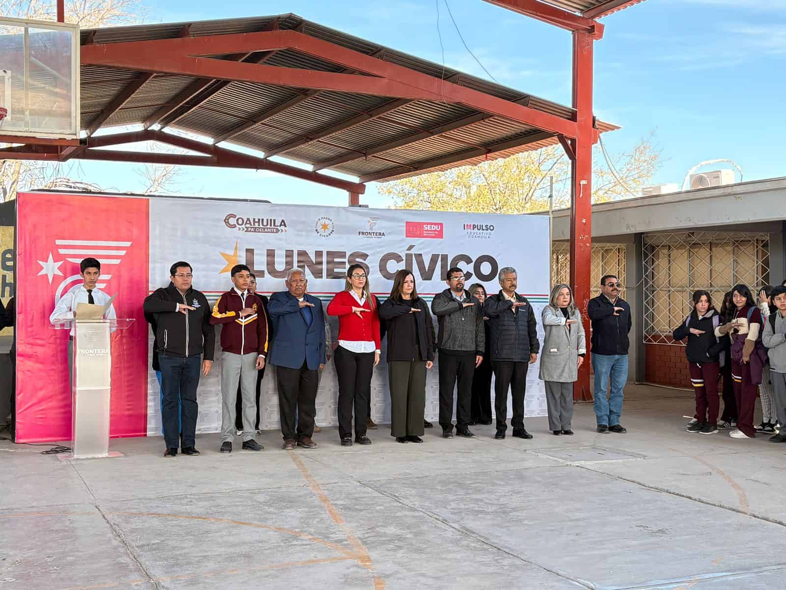 FRONTERA, COAHUILA.- La alcaldesa de Frontera, Sara Irma Pérez Cantú, encabezó el lunes cívico en la Secundaria Técnica 64 Netzahualcóyotl, ubicada en la colonia Sierrita, donde destacó la importancia de fortalecer las acciones patrióticas dentro de los planteles educativos como parte de la formación integral de los estudiantes.