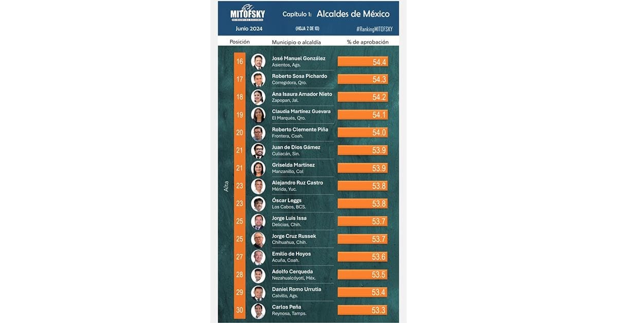 De acuerdo al ranking, el alcalde fronterense se ubica solo por debajo de Claudia Martínez de Querétaro y seguido de Juan de Dios Gámez de Culiacán, Sinaloa con el 54. 0 por ciento.