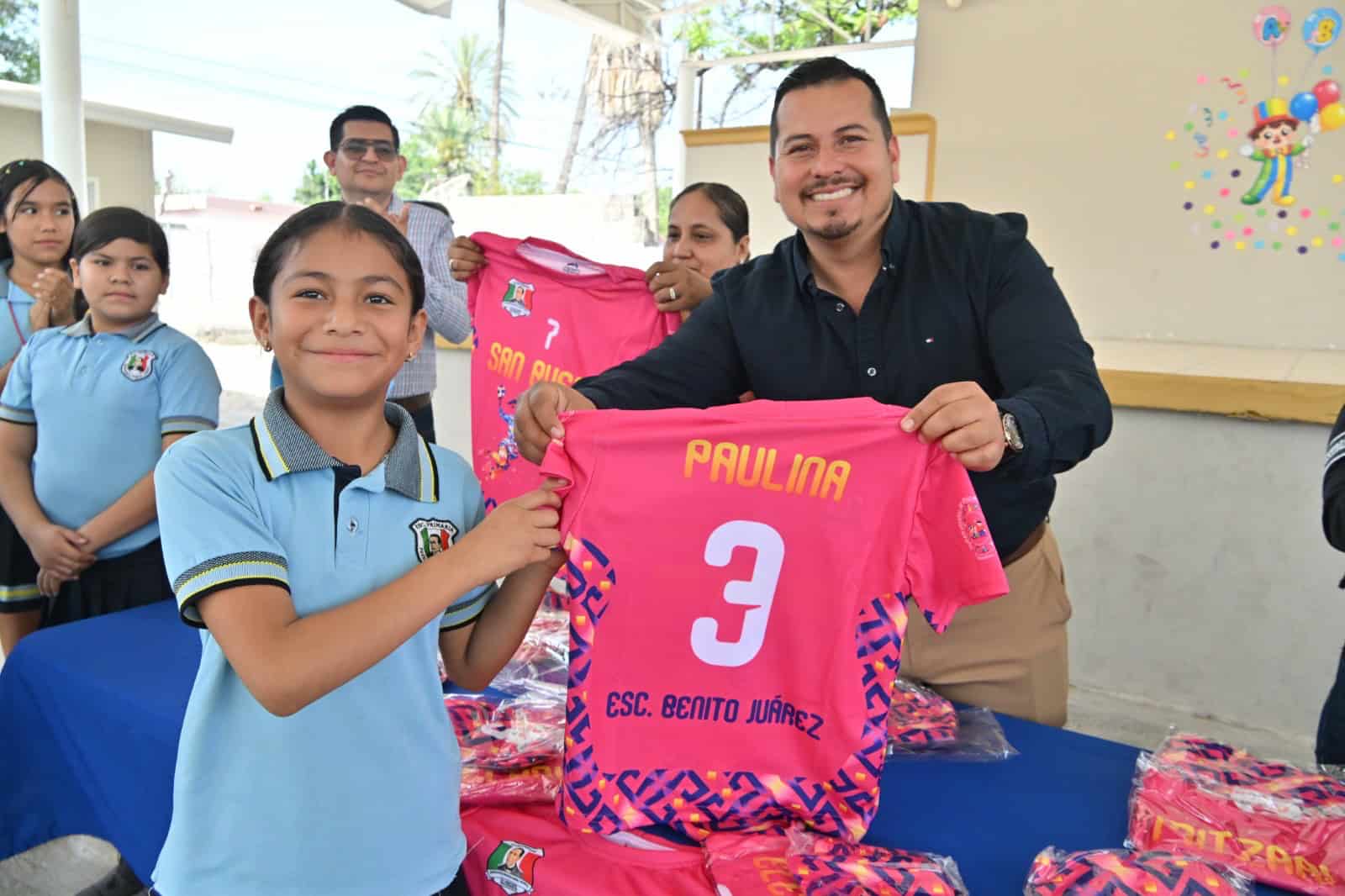 Asimismo, el edil realizó la entrega de uniformes deportivos al equipo de handball de la Escuela Primaria Presidente Benito Juárez, quienes representarán al municipio en un próximo torneo que se llevará a cabo en la ciudad de Monclova.