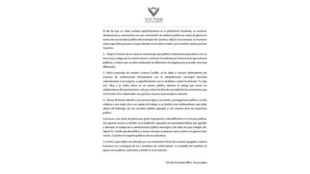 En el comunicado, también se señala que Lorenzo Carrillo ha mantenido una postura constante de confrontación con la administración municipal, atacando específicamente a mujeres en el poder, sobre todo a la alcaldesa con términos que calificó como “soeces y vulgares”. Villalobos lo acusó de denostar públicamente el trabajo de la alcaldesa y su equipo, generando división en la población mediante discursos ofensivos y sin fundamento.