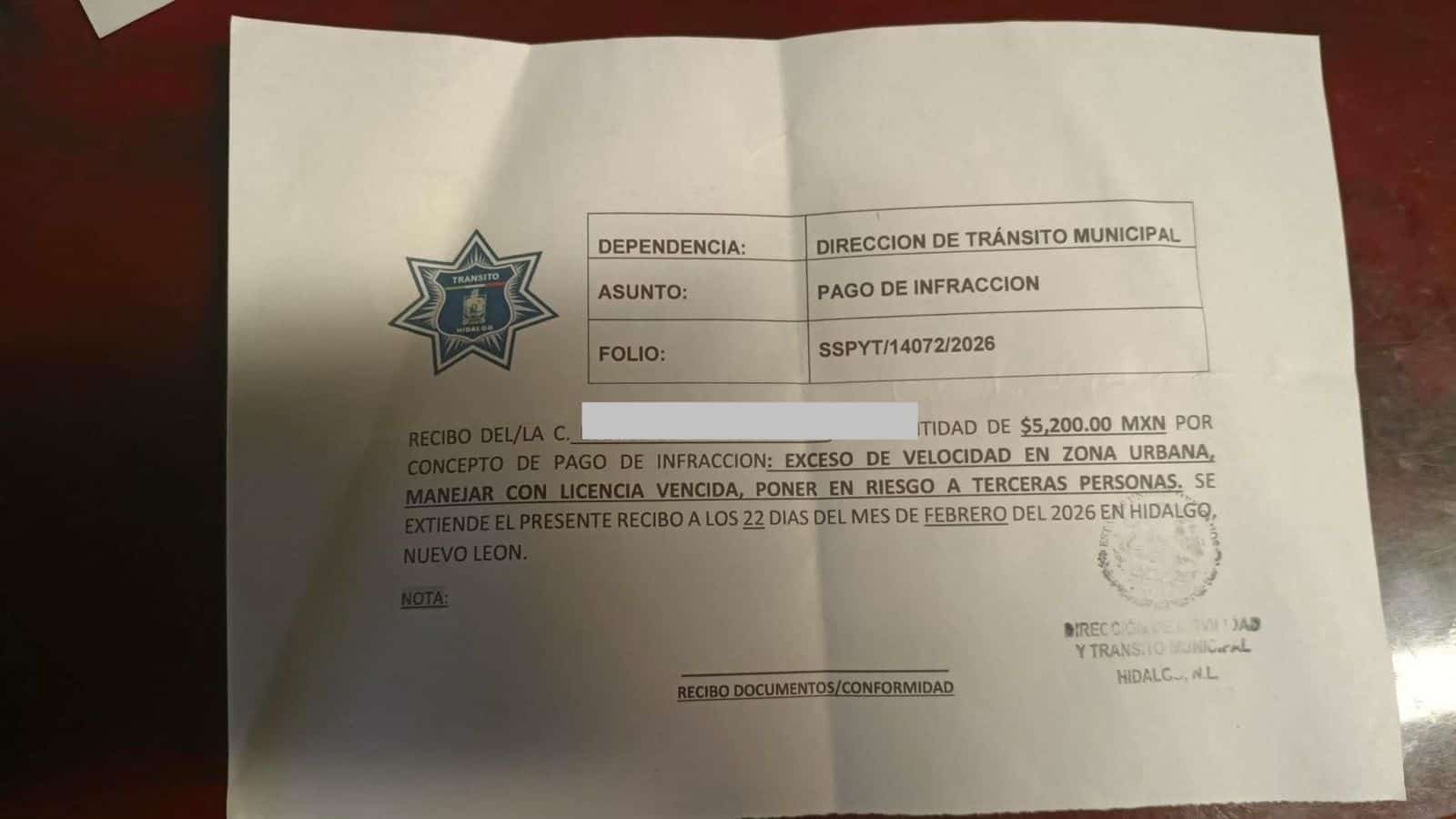 Entre los casos exhibidos destaca un recibo por 5 mil 200 pesos, presuntamente expedido por la Dirección de Tránsito Municipal de Hidalgo, en el que se señalan diversas faltas en un mismo documento.