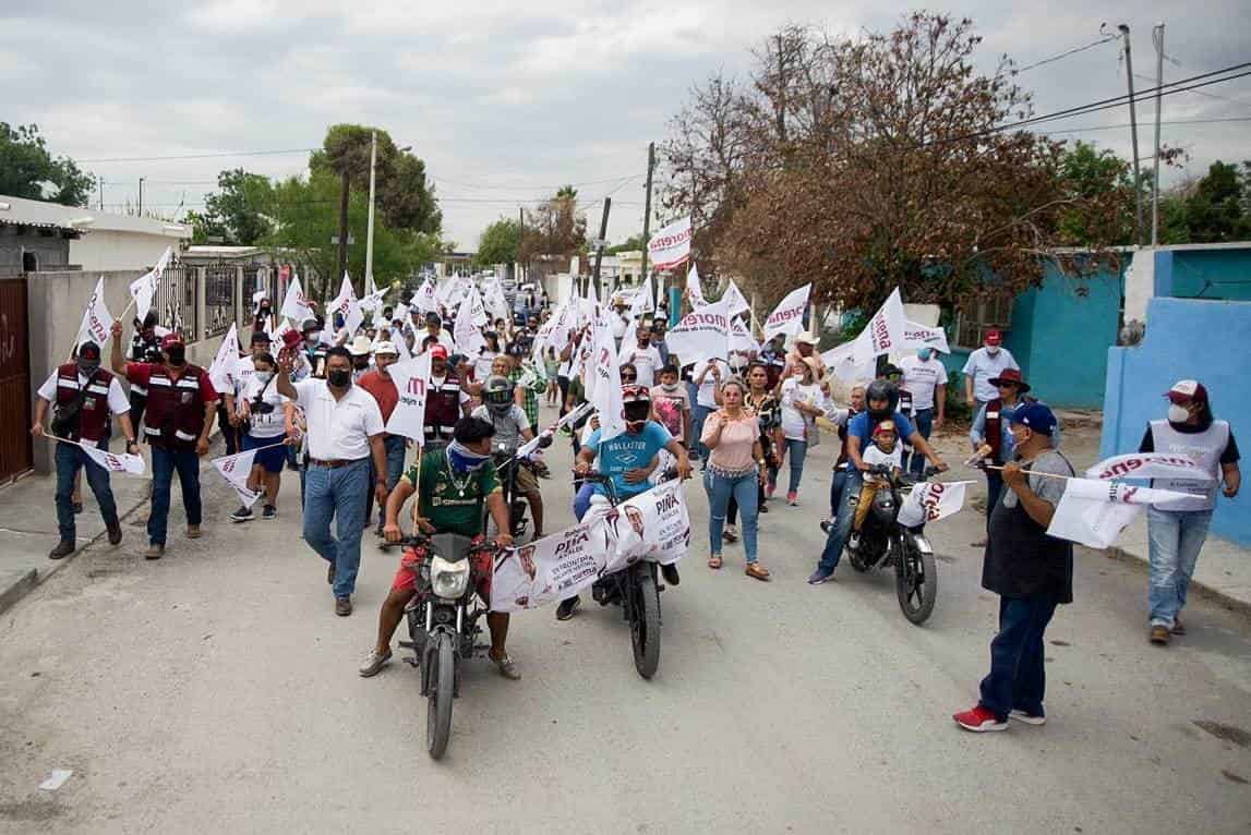 Frontera, Coah.- Cientos de ciudadanos se unieron a la megacaminata que encabezó el candidato de Morena a la alcaldía de Frontera, Roberto Piña, por las calles del ejido La Cruz y 8 de Enero.