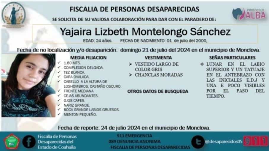 La Fiscalía General del Estado ha confirmado que la osamenta hallada en el ejido Saca de Bucarelli pertenece a Yajaira Lizbeth Montelongo Sánchez, la joven de 24 años reportada como desaparecida el pasado 21 de julio en San Buenaventura.