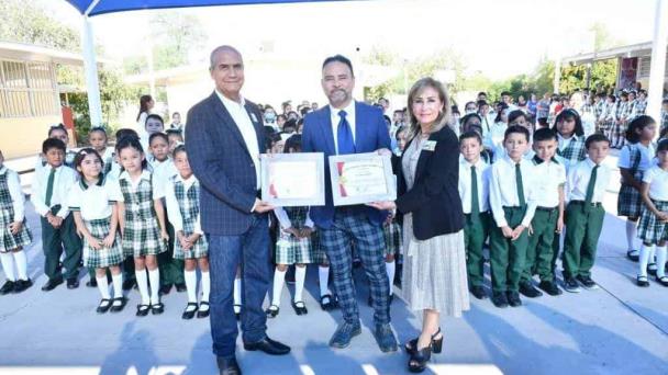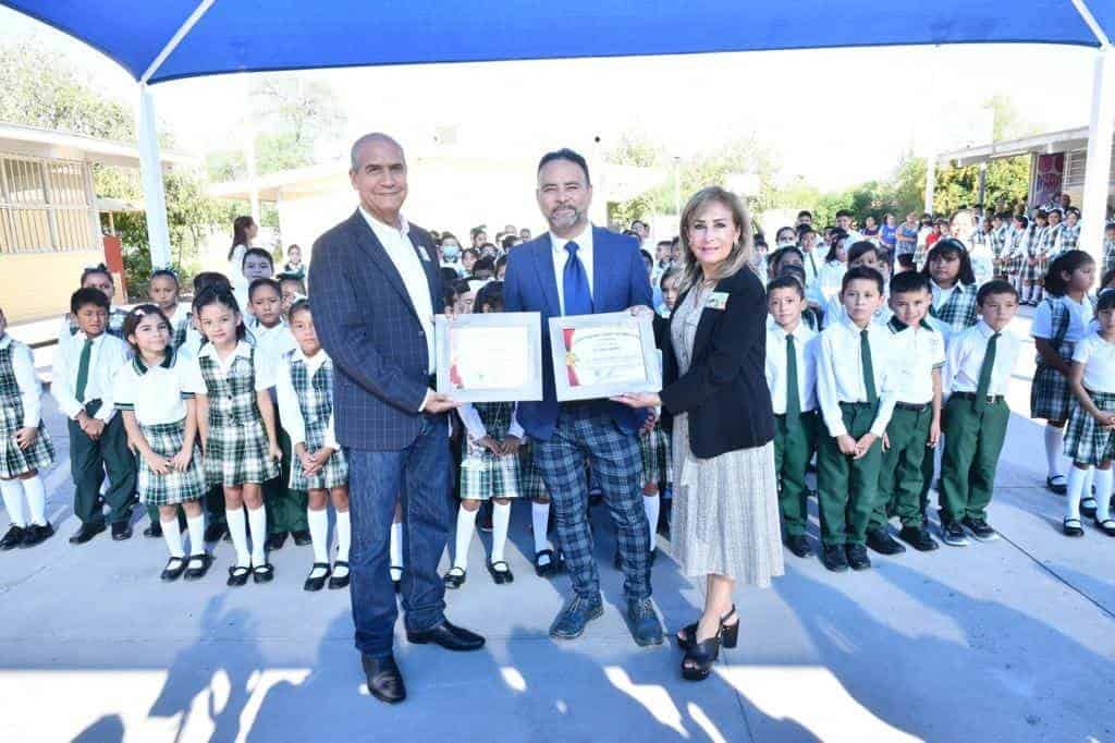 Antes de concluir el evento, el director del plantel Mario Alberto Saucedo, a nombre de materos, alumnos y personal docente, hizo entrega al alcalde Mario Dávila delgado y a Lic. Gladys Villarreal, directora de Educación, por el apoyo brindado a la institución educativa con la instalación de la malla sombra en beneficio de los más de 250 alumnos y sociedad en general.