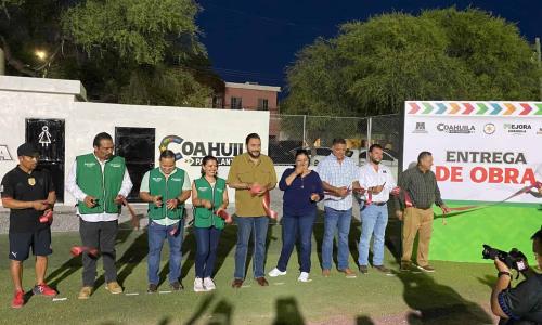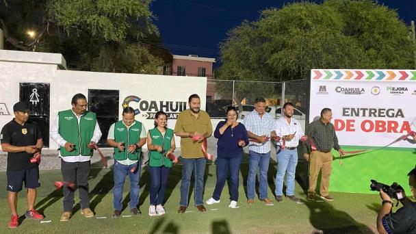 El alcalde Carlos Villarreal Pérez encabezó la entrega oficial de la rehabilitación de la cancha deportiva en la colonia Independencia, una obra que forma parte del plan de inversión municipal Prendamos Monclova.