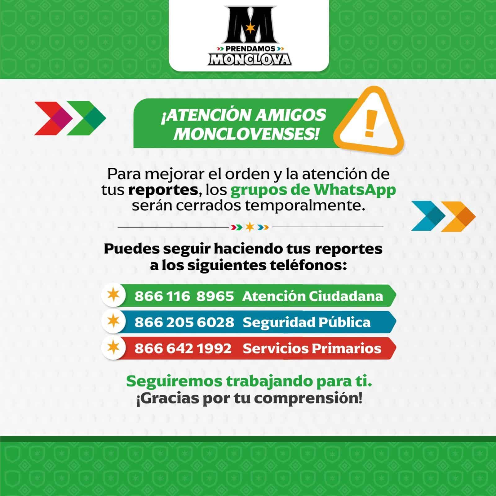 El pasado miércoles fueron eliminados los grupos, en donde se pidió a la ciudadanía que se comunicará de manera directa a las áreas de Seguridad Pública, Atención Ciudadana y Servicios Primarios en caso de tener algún reporte.