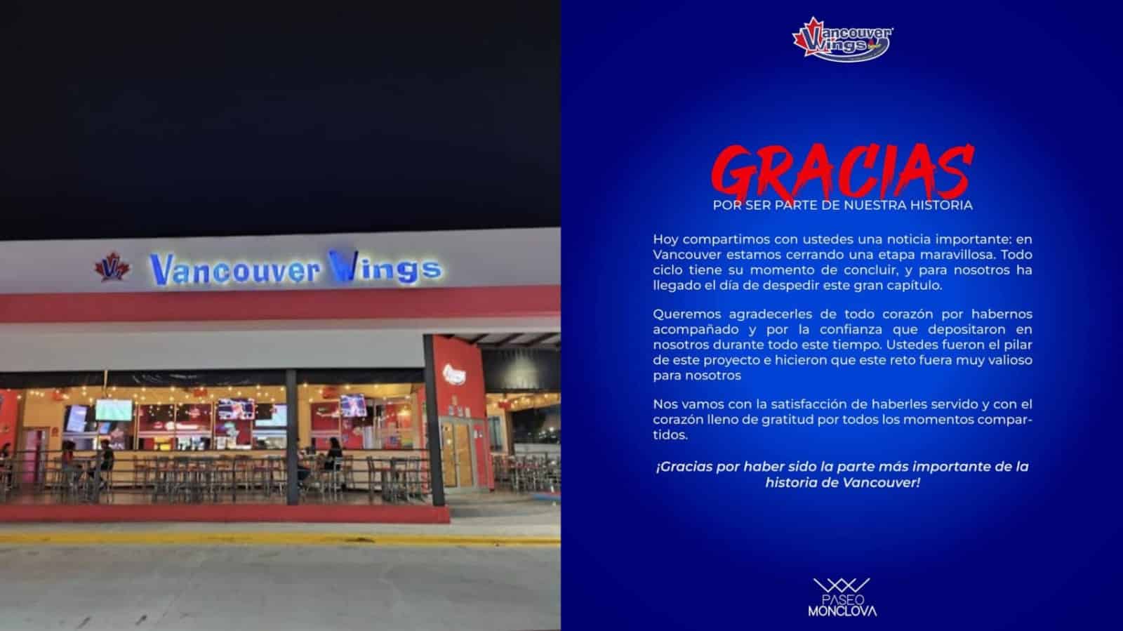 Monclova despide a una franquicia más. Vancouver Wings, negocio especializado en comida rápida, anunció el cierre de su sucursal ubicada en el Mall Paseo Monclova, tras casi cuatro años de operaciones en la ciudad.