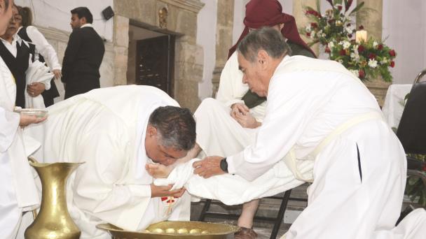 Al término del discurso, realizó el acto de humildad junto a otro sacerdote, quienes lavaron los pies a los doce apóstoles usando un recipiente de cobre, donde vertían agua y jabón para luego secarlos con una toalla blanca y por último depositar un beso.