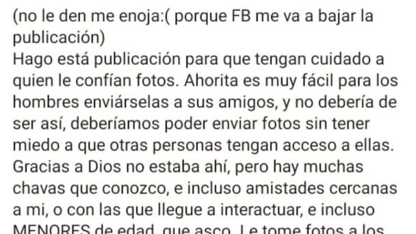 “Espero y se puedan tomar medidas legales para todos los que están en ese grupo, si alguna chica quiere saber si hay fotos de ella ahí, con toda confianza me puede hablar, no hay que tener vergüenza de nada”.