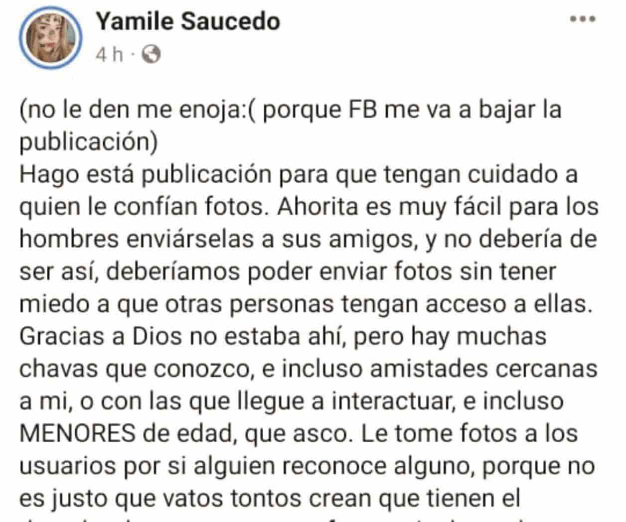 Mediante la red social de Facebook, Yamile dio a conocer un nuevo grupo de packs en Monclova, pidiendo a sus contactos el no confiarle a cualquier persona sus fotos íntimas, señalando que es muy fácil para los hombres el enviárselas a sus amigos.