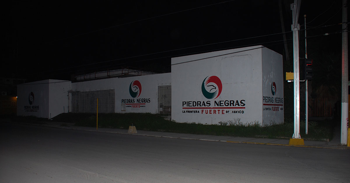 Las luces de los semáforos bañan el lugar, pero son insuficientes para iluminar un edificio que tiene pintado los logos del gobierno municipal.