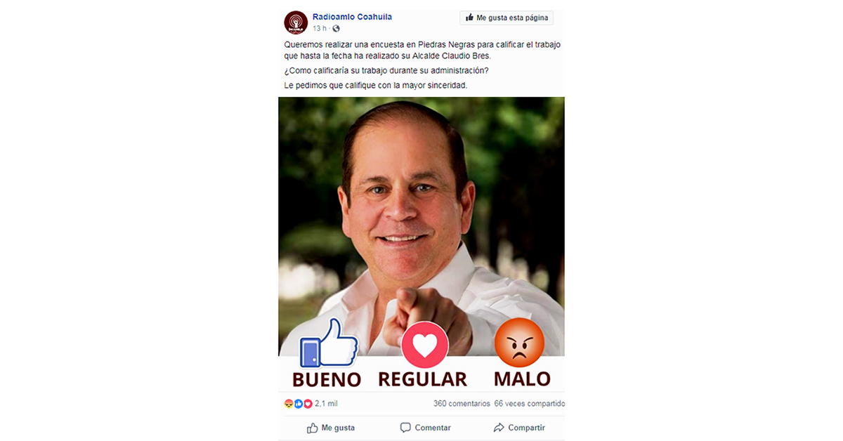 El 70 por ciento de 2 mil 452 ciudadanos califica como malo el desempeño del alcalde de Piedras Negras Claudio Bres Garza, según revela una encuesta que realiza Radio AMLO en redes sociales.