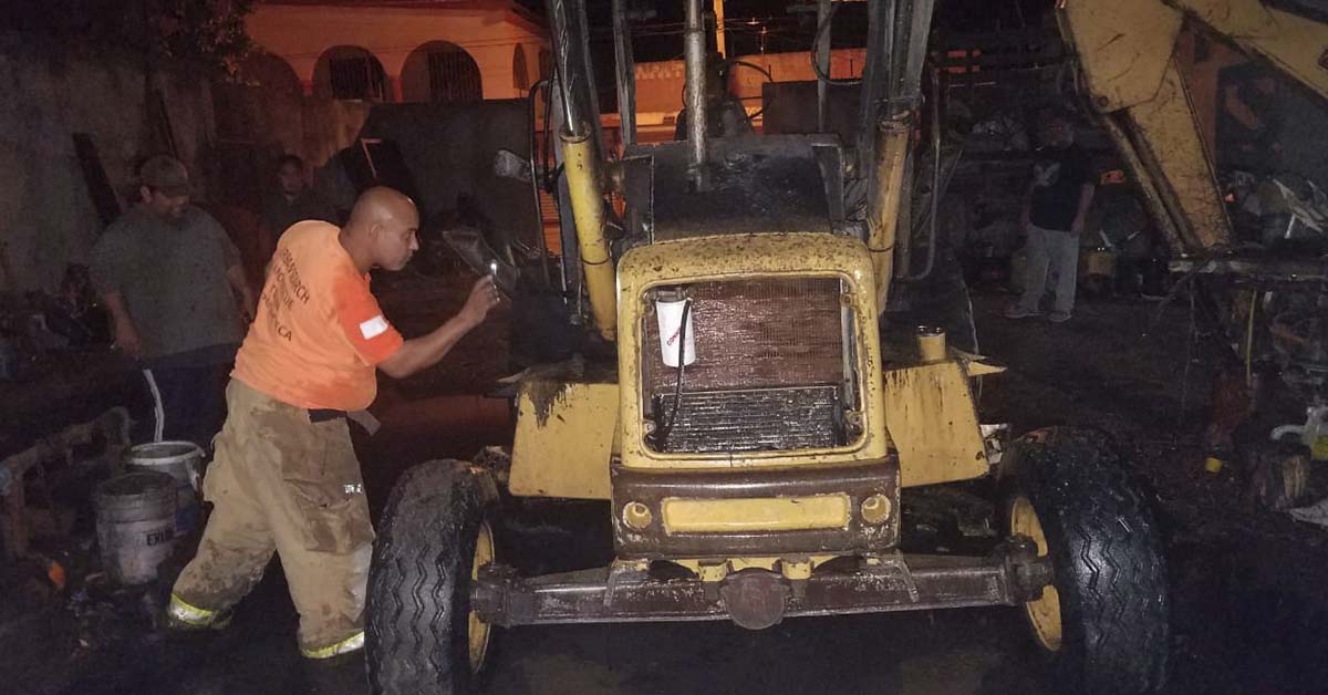MELCHOR MÚZQUIZ, COAH.- Una máquina retroexcavadora terminó consumida por el fuego por un aparente corto circuito que se inició luego de que se le daba mantenimiento en un taller de esta localidad.