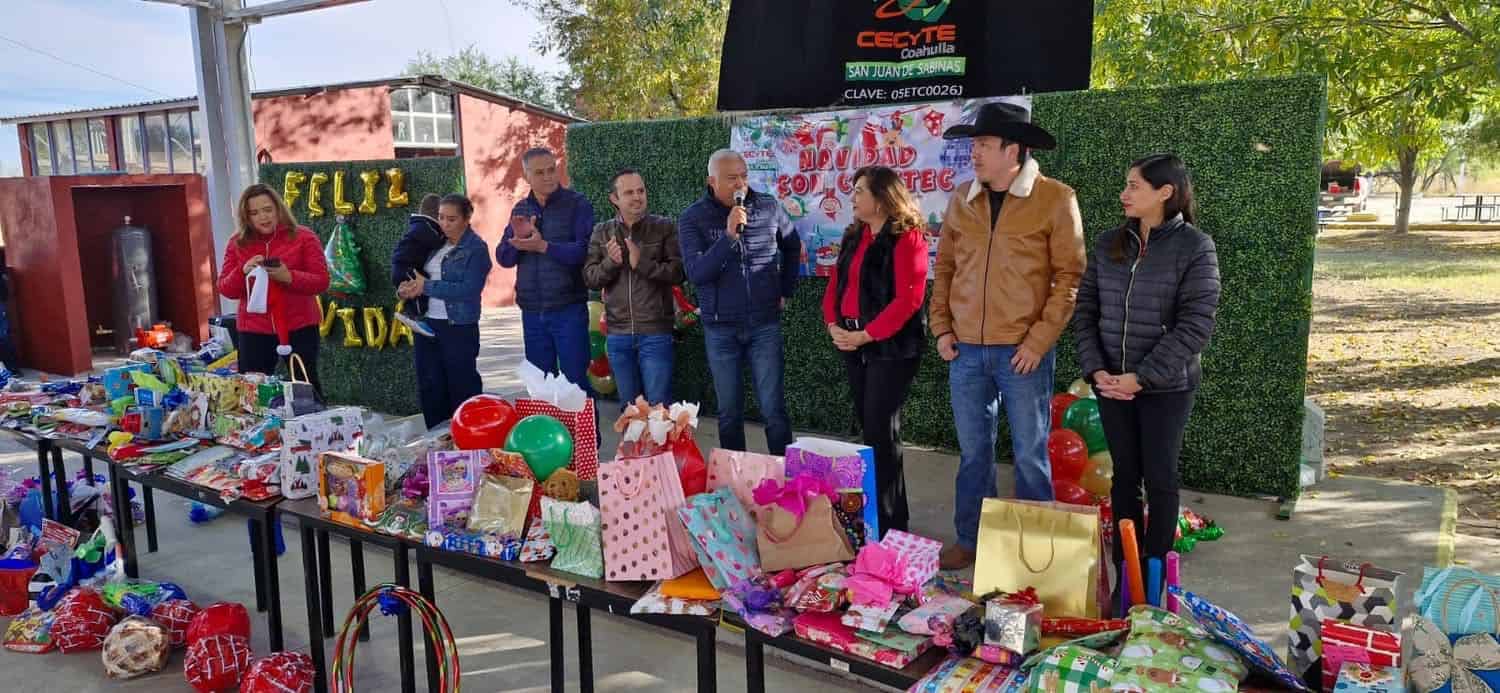 NUEVA ROSITA, COAH.- Más de 60 niños de nivel preescolar y primaria fueron beneficiados con la entrega de juguetes como parte del programa Navidad con Cecytec 2025, impulsado por el Centro de Estudios Científicos y Tecnológicos del Estado de Coahuila (Cecytec) en la Villa de San Juan.