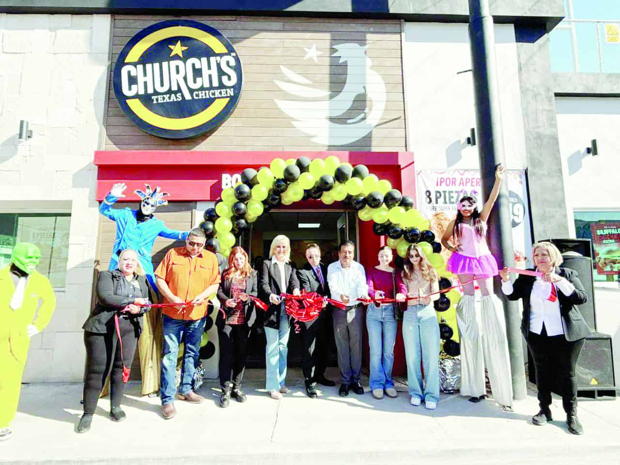 Múzquiz, Coah.- La Presidenta Municipal, Laura Jiménez Gutiérrez, acompañada de los inversionistas Luis Lauro Hinojosa Margain, Boreque Martínez González y el director de franquicias Juan Ibarra, encabezó el corte de listón del nuevo restaurante Church´s Texas Chicken en Múzquiz.