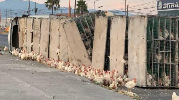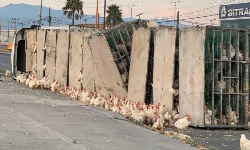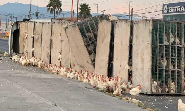 Ramos Arizpe.– La mañana de este miércoles, un tráiler que circulaba por el libramiento Óscar Flores Tapia, a la altura de su cruce con el bulevar Miguel Ramos Arizpe, terminó volcado sobre su costado izquierdo, dejando su carga de pollos y gallinas esparcida en el asfalto.