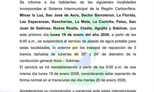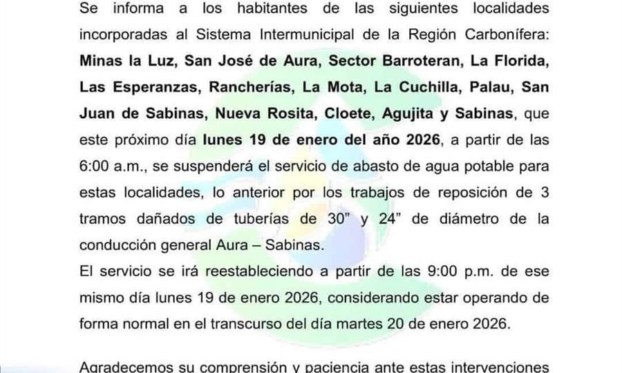 SABINAS, COAH.- El Sistema Intermunicipal de Aguas y Saneamiento de Múzquiz, San Juan de Sabinas, Sabinas y Progreso (SIMARC) informó que este lunes 19 de enero de 2026 se llevará a cabo una suspensión temporal del servicio de agua potable en diversas localidades de la Región Carbonífera, debido a trabajos de reposición en la infraestructura hidráulica principal.