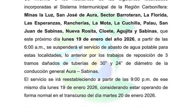 Las comunidades afectadas por esta medida incluyen Minas la Luz, San José de Aura, Sector Barroterán, La Florida, Las Esperanzas, Rancherías, La Mota, La Cuchilla, Palau, San Juan de Sabinas, Nueva Rosita, Cloete, Agujita y Sabinas. La interrupción del suministro comenzará a las 6:00 a.m. y se debe a la reparación de tres tramos dañados de tuberías de 30 y 24 pulgadas de diámetro en la conducción general Aura–Sabinas.