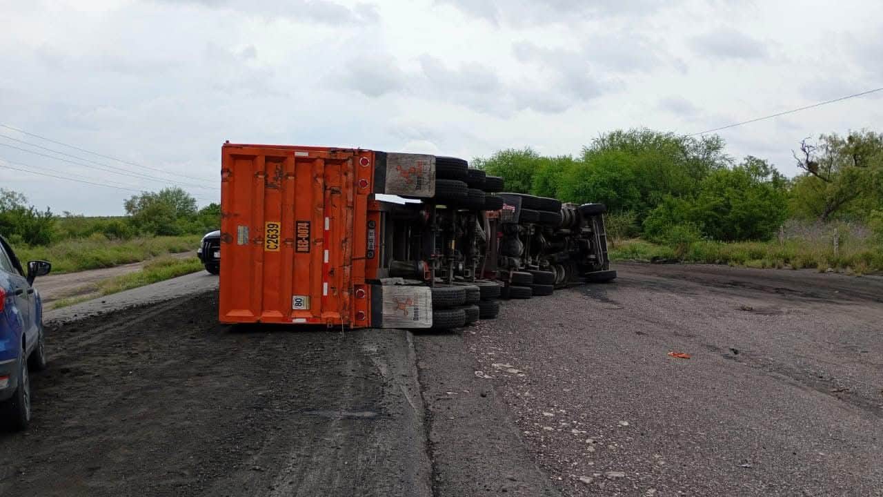 NUEVA ROSITA, COAH.- La mañana de este viernes, un tráiler quinta rueda volcó sobre la carretera Federal 57, en el tramo Allende-Nueva Rosita, específicamente en la cuesta El Infante.