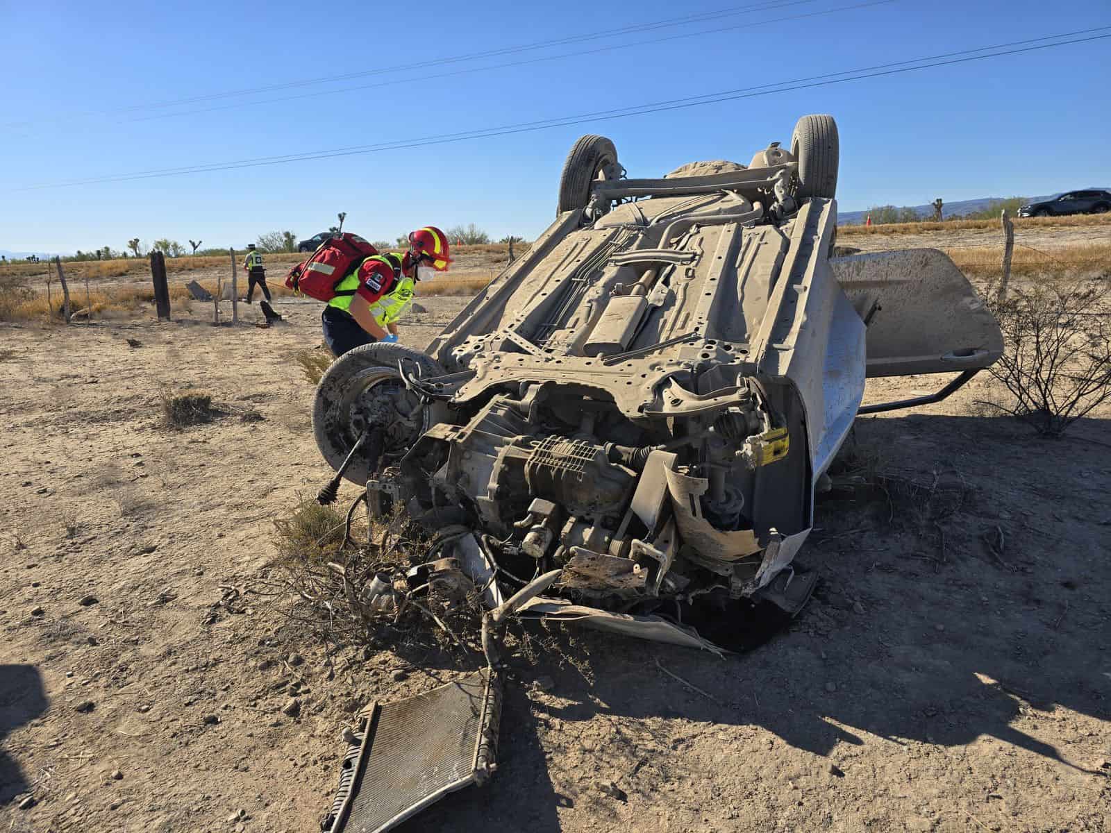 El percance ocurrió a la altura del kilómetro 86, cerca del ejido La Paloma, cuando un automóvil Ford Fiesta, con placas FFT-909-D, salió de la cinta asfáltica presuntamente debido al exceso de velocidad, terminando volcado a aproximadamente 40 metros de la carretera, sobre terreno de terracería.