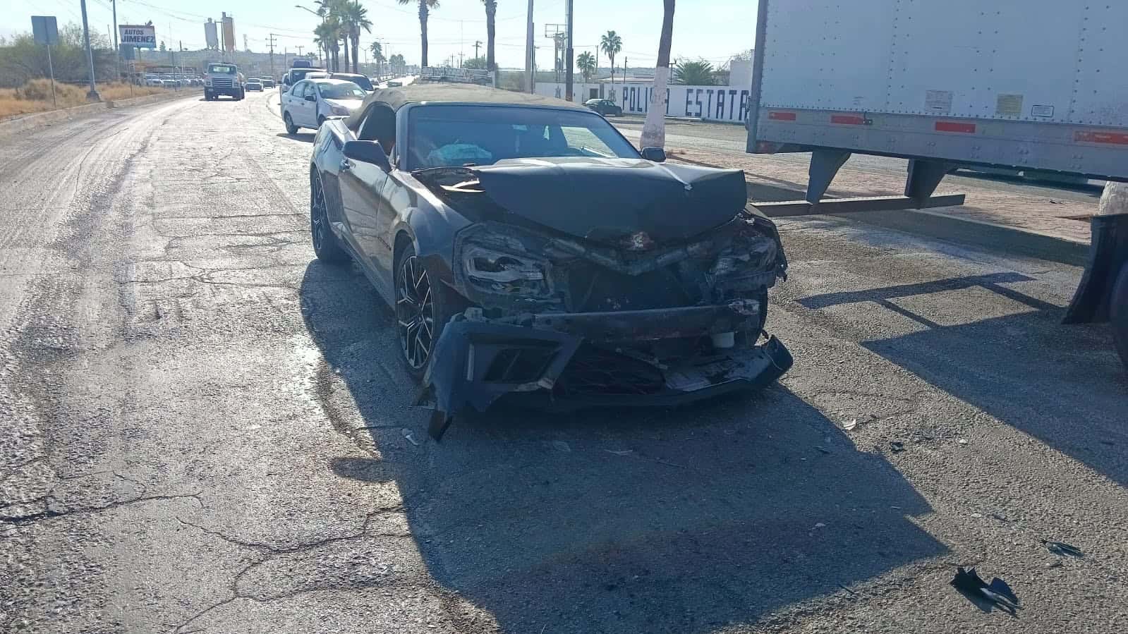 SABINAS, COAH.- Un choque por alcance se suscitó en la carretera federal 57, a la altura de la Villa de Agujita, entre un vehículo Chevrolet Camaro color negro con placas de circulación del estado de Texas y una camioneta Nissan NP300 conducida por trabajadores de una empresa avícola.
