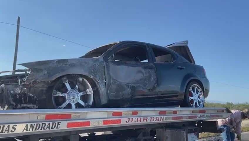 Elementos de bomberos con destacamento en la comunidad de Progreso, Coahuila se desplazaron al perímetro para iniciar con las labores de sofocamiento y enfriamiento del auto Dodge Avenger, de reciente modelo.