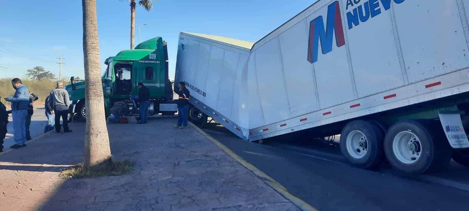 El tráiler quedó literalmente trepado sobre el camellón central del boulevard Benito Juárez (Carretera Federal 57) con severos daños materiales, mientras que el remolque terminó “partido a la mitad”.