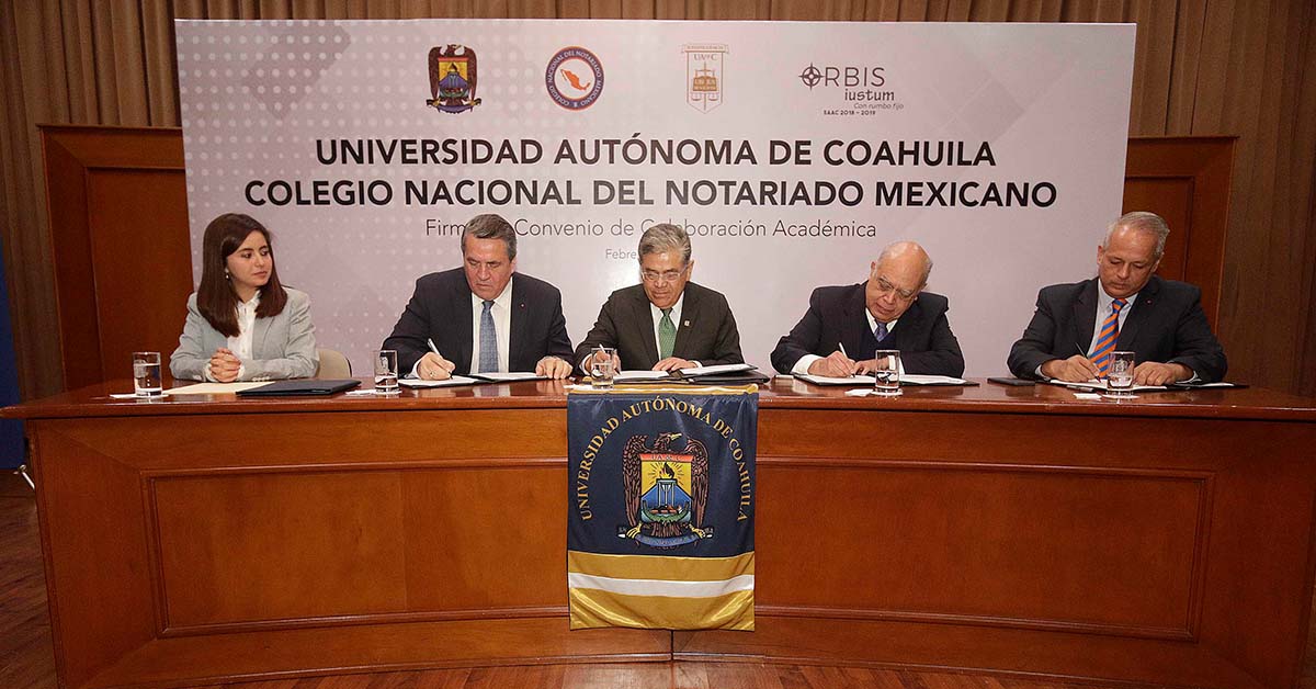 SALTILLO, Coah.- Con el compromiso de seguir formando alianzas con diversas instituciones en beneficio de los universitarios, la Universidad Autónoma de Coahuila a través de la Facultad de Jurisprudencia, firmó un convenio de colaboración con el Colegio Nacional del Notariado Mexicano.