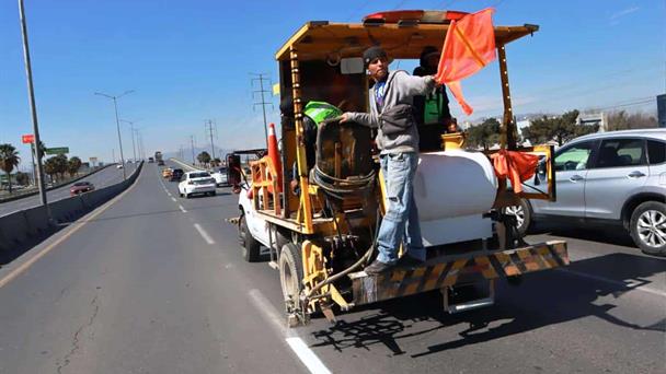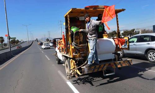 A través de brigadas de “Aquí Andamos”, el Gobierno de Saltillo aplica pintura blanca con reflejante para delimitar de manera correcta los carriles viales, además de pintar de amarillo los laterales, muros de contención y cordones cuneta, a fin de permitir una mejor visibilidad, orden en la circulación vehicular y prevención de accidentes.