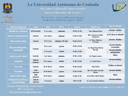 SALTILLO, Coahuila.- La Universidad Autónoma de Coahuila, a través de la Coordinación de Difusión y Patrimonio Cultural, invita a participar a los cursos y talleres que se impartirán en las instalaciones del recinto cultural “Aurora Morales de López”.