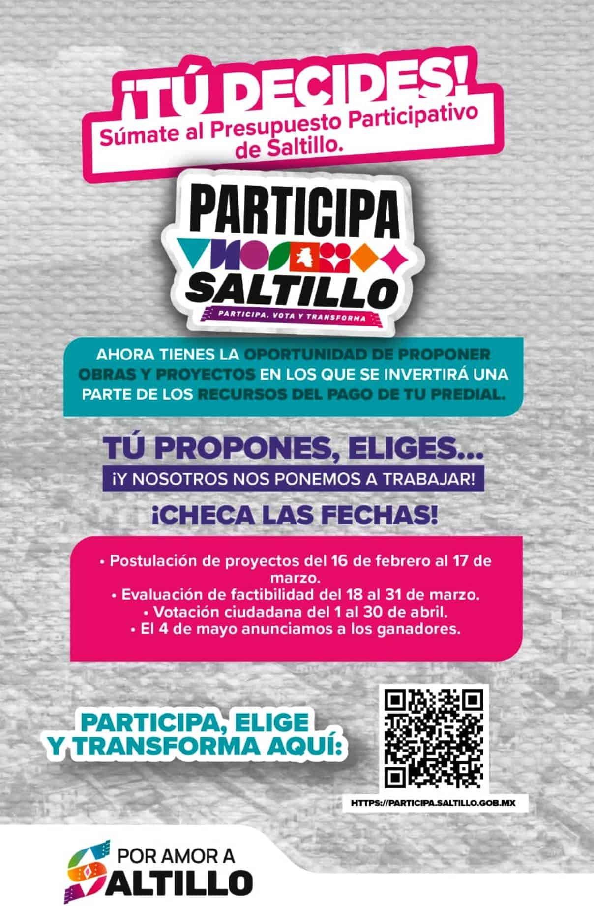 SALTILLO, COAHUILA.- El alcalde Javier Díaz González informó que se encuentra abierto el proceso de postulación de proyectos de Participa Saltillo 2026, en el que las y los ciudadanos tienen la posibilidad de elegir obras o acciones que deseen implementar en el sector en el que viven.