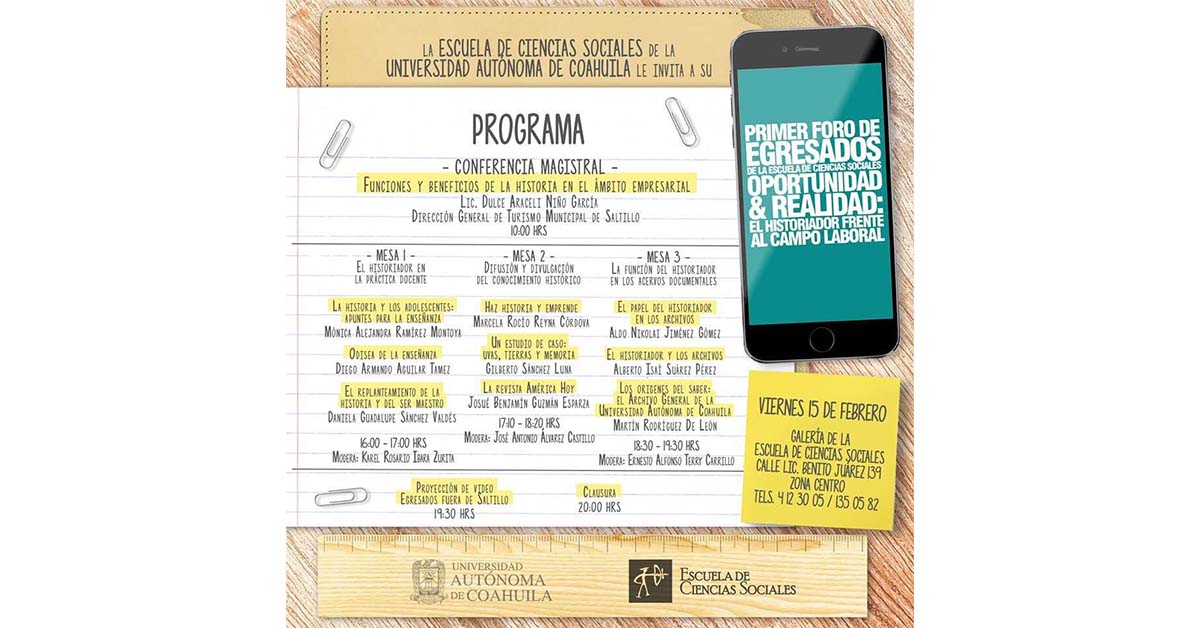 SALTILLO, Coah.- La Universidad Autónoma de Coahuila, a través de la Escuela de Ciencias Sociales, invita a participar en el Primer Foro de Egresados “Oportunidad y Realidad: El Historiador Frente al Campo Laboral”, a efectuarse este viernes 15 de febrero.