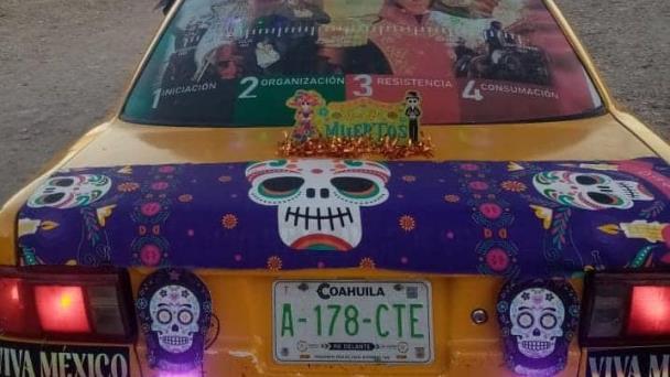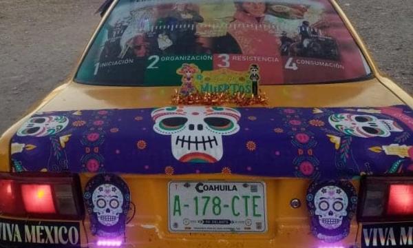 SALTILLO, COAHUILA.- El popular “Renotaxi”, que durante diciembre se convierte en un reno navideño, ha vuelto a ser tema de conversación entre los saltillenses al circular ahora como una ofrenda móvil por el Día de Muertos.