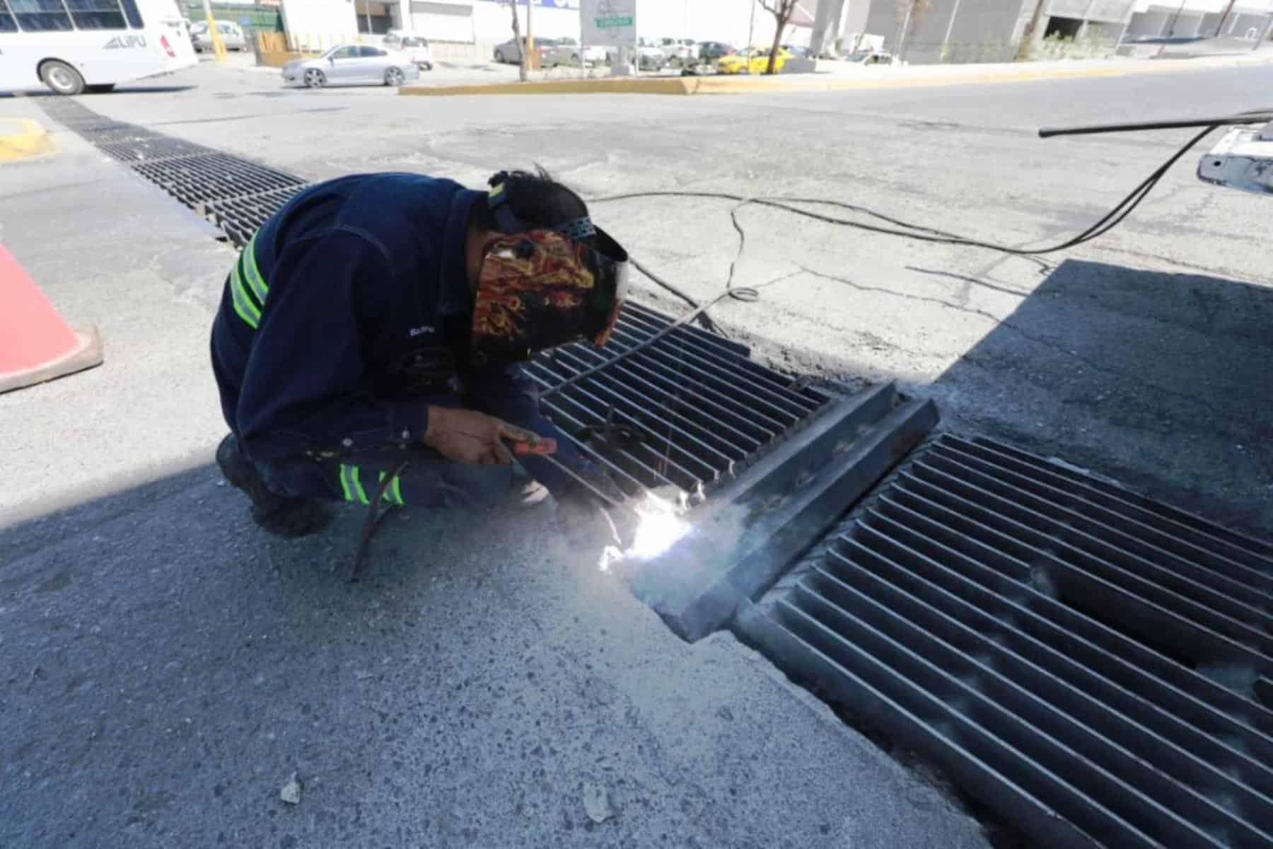 Asimismo, cuadrillas del programa "Aquí Andamos" realizan labores de atención de las rejillas pluviales ubicadas en diversas vialidades principales de la ciudad, con acciones de inspección, alineación, soldadura y sustitución de piezas dañadas en lugares que presentaban desgaste por el paso constante de vehículos o por el paso del tiempo.