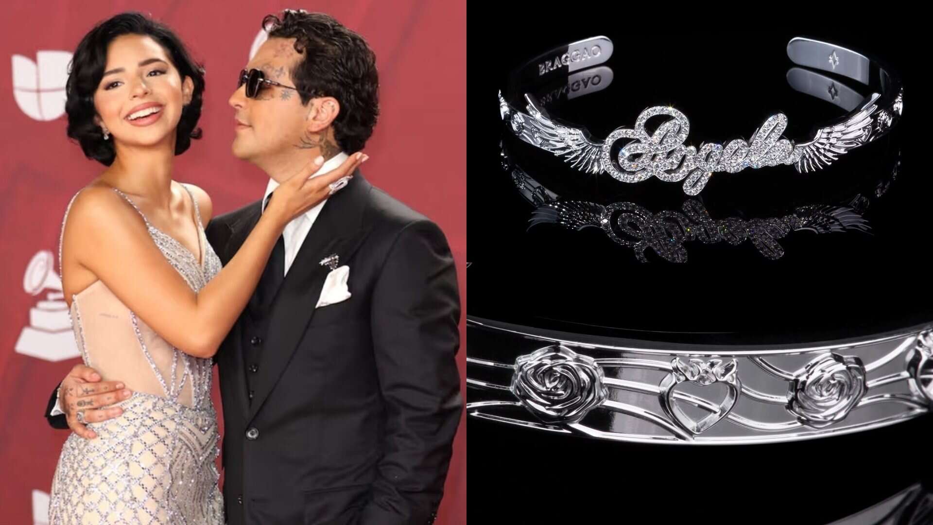 En medio de los festejos, comenzó a viralizarse la imagen de un brazalete de alta joyería personalizado con el nombre "Ángela", lo que desató especulaciones sobre un nuevo obsequio romántico de Nodal hacia su pareja. La pieza, creada por la firma Braggao, está elaborada en oro blanco y cubierta de diamantes, además de incluir alas de ángel, corazones en llamas y rosas grabadas.