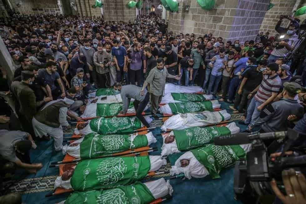 Con la vía pública casi vacía de tráfico y peatones y la mayoría de los dos millones de habitantes encerrados en casa ante bombardeos de los que no se pueden proteger con refugios antiaéreos, cientos de personas salieron para enterrar a varios milicianos de las Brigadas Al Qasam -el ala militar de Hamás- muertos en recientes ataques israelíes.
