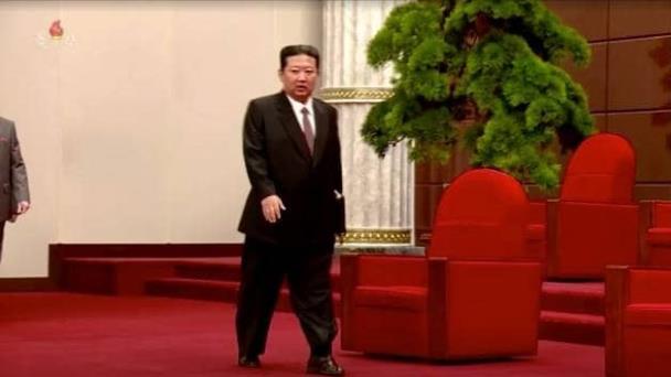 Kim caminó sobre la alfombra roja de un lujoso salón usando lo que parecían ser huaraches negros brillantes con calcetines negros, con un traje oscuro, corbata burdeo y anteojos de media montura, según un video transmitido este lunes por medios estatales.