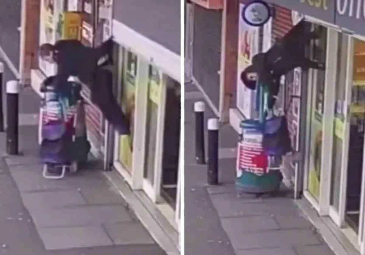 En ese momento, las persianas automáticas se levantan y se enganchan en la ropa de la mujer, quien rápidamente toma su bastón y el carrito de compras que previamente había seleccionado; todos fueron elevados en ese momento.