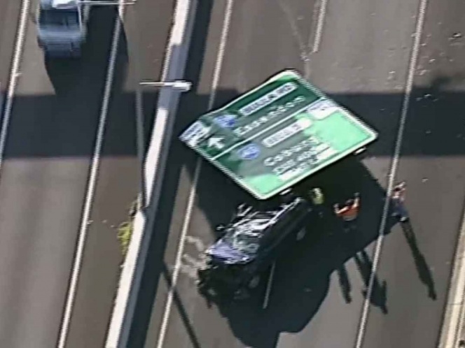 El letrero de 4 por 5 metros, que estaba sobre la autopista Tullamarine cerca del aeropuerto de Essendon, se desprendió y cayó al auto alrededor de las 17:30 horas de ayer.