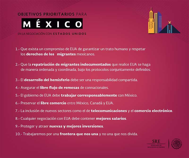 Al hacer un pronunciamiento en materia de relaciones exteriores, enfatizó que el gobierno de la República trabajará por una frontera que nos una, y no que nos divida, pues si bien México reconoce los derechos de toda nación soberana para garantizar su seguridad, “no cree en los muros".