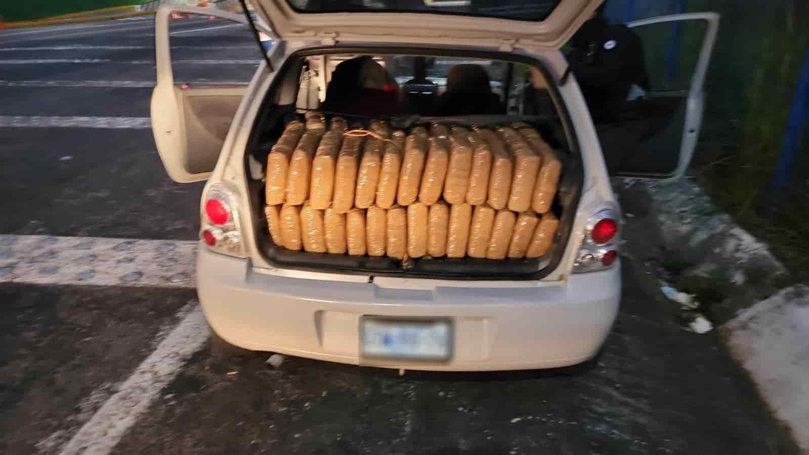 En la cajuela del vehículo, cubiertos con una manta, localizaron un total de 91 paquetes rectangulares envueltos con cinta canela que contenían hierba verde y seca con las características propias de la marihuana. En tanto, en el asiento trasero, ocultos con una sábana, se ubicaron 75 paquetes más con la posible droga.