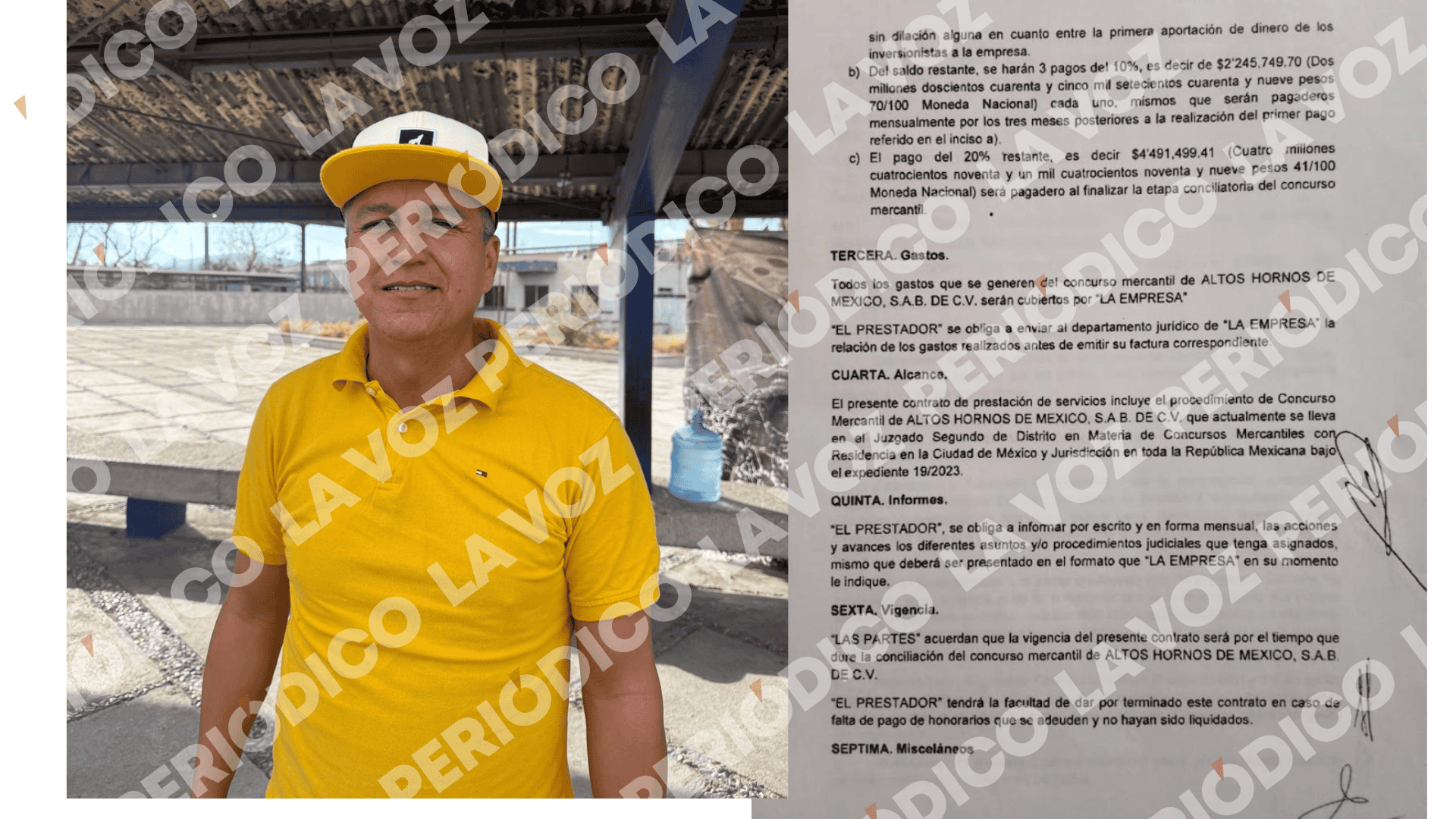 De acuerdo con la información exhibida, el contrato señala que el síndico cobraría 13 mil 620.70 pesos por la visita inicial a AHMSA y 22 millones 457 mil 497.07 pesos por el proceso de conciliación, mismos que serían cubiertos en distintas etapas.