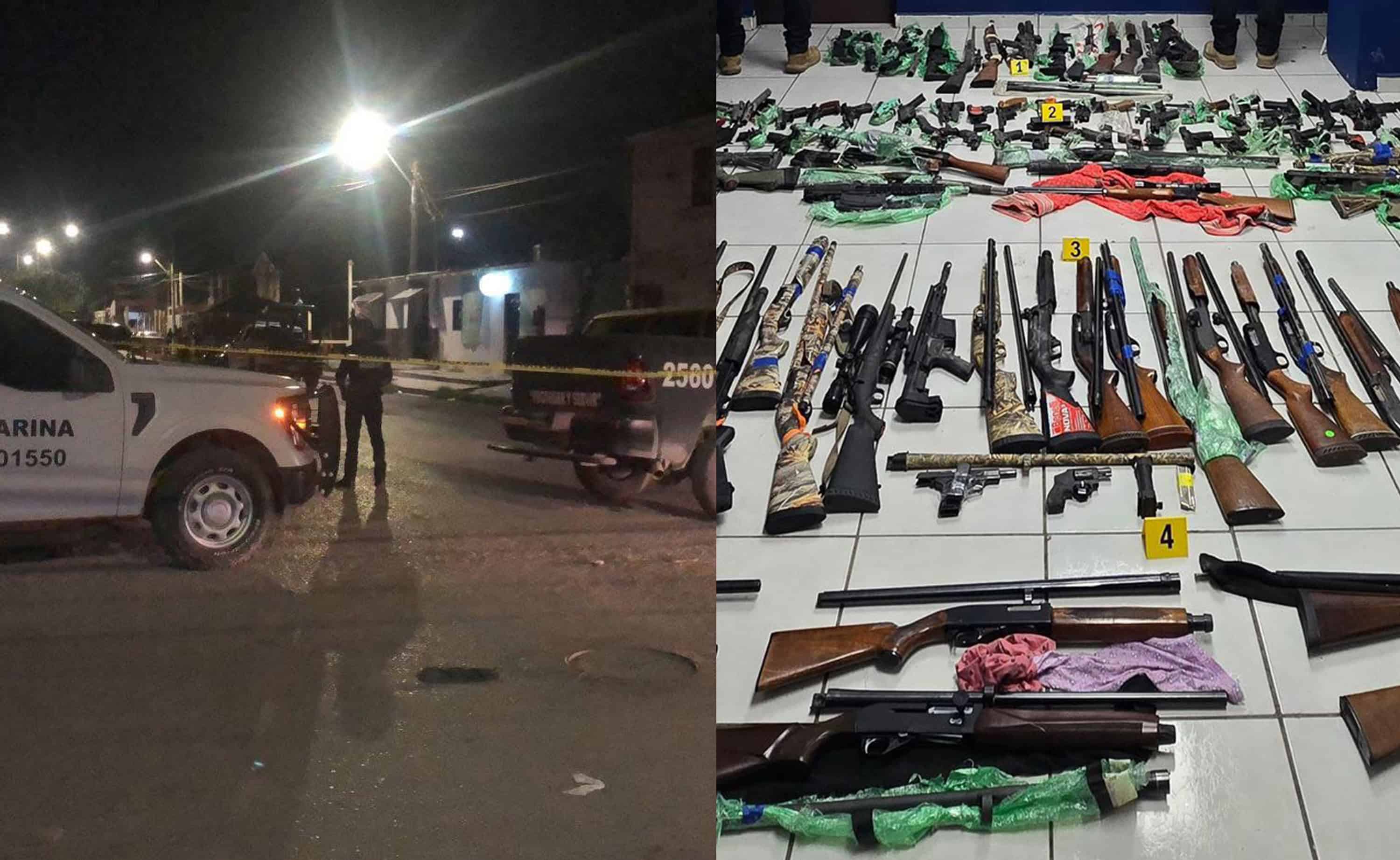 Durante la intervención, elementos de la Agencia de Investigación Criminal, en coordinación con corporaciones estatales y fuerzas federales, localizaron en el interior de la propiedad un total de 116 armas de fuego, entre ellas 60 largas y 56 cortas, que presuntamente serían enviadas a otras entidades del país.