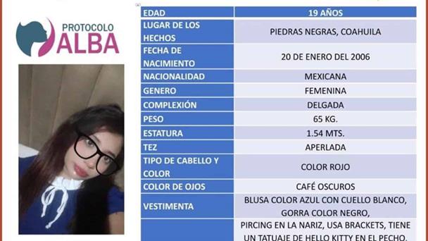 PIEDRAS NEGRAS, COAH.— La Fiscalía General del Estado de Coahuila activó el Protocolo Alba para solicitar el apoyo de la ciudadanía en la búsqueda de Melany Alejandra Sánchez Ruiz, una joven de 19 años reportada como desaparecida en Piedras Negras.