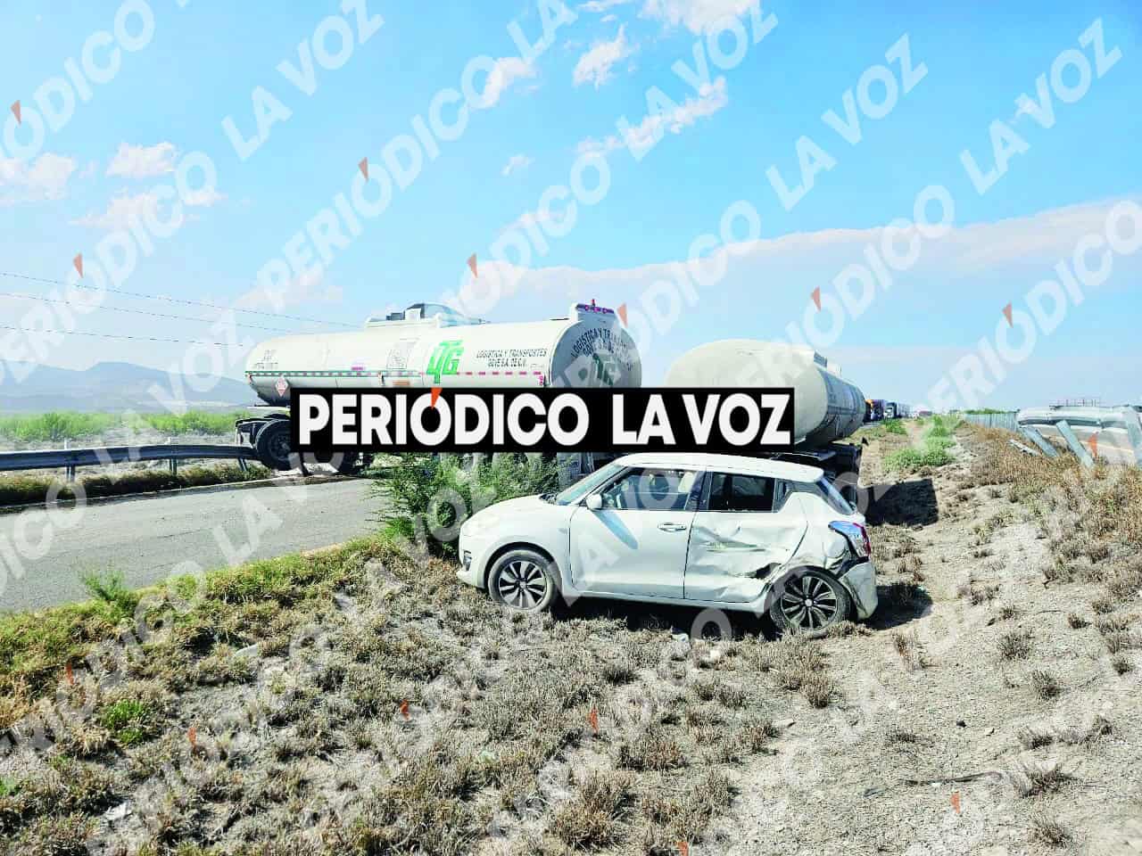 ESCOBEDO, COAH.– Una aparatosa volcadura registrada la tarde de este sábado sobre la carretera federal 57 encendió las alarmas entre corporaciones de auxilio, luego que un autotanque de doble remolque terminara fuera del camino, dejando como saldo dos mujeres lesionadas y cuantiosos daños materiales.