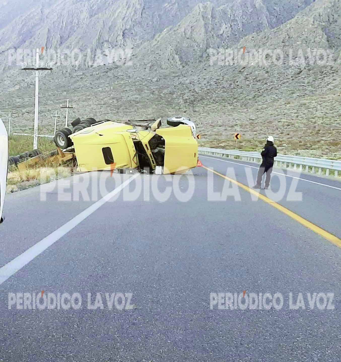 El percance se registró alrededor de las 06:50 horas, en el tramo Cuatro Ciénegas–San Pedro, a la altura del kilómetro 102, donde automovilistas que circulaban por la zona alertaron a las autoridades tras observar la pesada unidad fuera del camino.