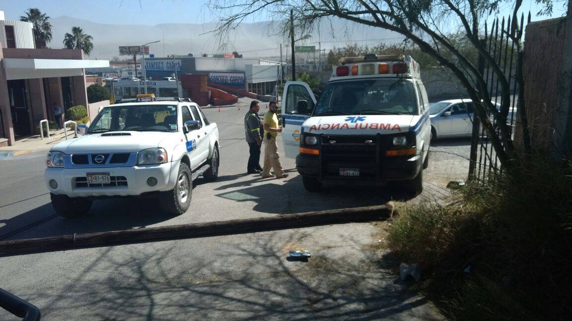 Hora CeroAmbulancia se queda sin frenos y choca Por Mario Alemán - 22 enero, 2017 - 02:21 a.m. Compartir en Unidad derriba poste de madera Tras quedarse sin frenos, una ambulancia de AHMSA terminó derribando un poste de madera de Telmex e impactándose contra la barda del Museo Harold R. Pape la mañana de ayer.El aparatoso accidente vial se registró a las 12:50 horas de ayer, sobre la calle Ecuador y la avenida República del Salvador de la colonia Guadalupe, hasta donde se dirigieron cuerpos de rescate y la Policía Municipal.En el lugar encontraron un poste de madera derribado y una ambulancia marca Chevrolet 3500, modelo 2006, de color blanca, propiedad de AHMSA, impactada contra la barda del museo.Su conductor Juan Manuel Flores Galindo, de 42 años, vecino de la calle Privada Carlos Avedrock Dávila, número 1130, de la colonia Eva Sámano, explico a la policía que cuando subía la pendiente del lugar, la unidad se quedó sin frenos y avanzó en reversa.Elementos de Control de Accidentes tomaron conocimiento y aseguraron la ambulancia mediante una grúa la cual sería resguardada hasta que se paguen los daños ocasionados.Artículos Relacionados Hora Cero Madre e hija lesionadas tras volcadura por ne... Hora Cero Juan Dávila hallado muerto en bodega de Moncl... Hora Cero Hombre herido con fractura en riña de quinta ... Hora Cero Veladoras encendidas provocan incendio en Mon...